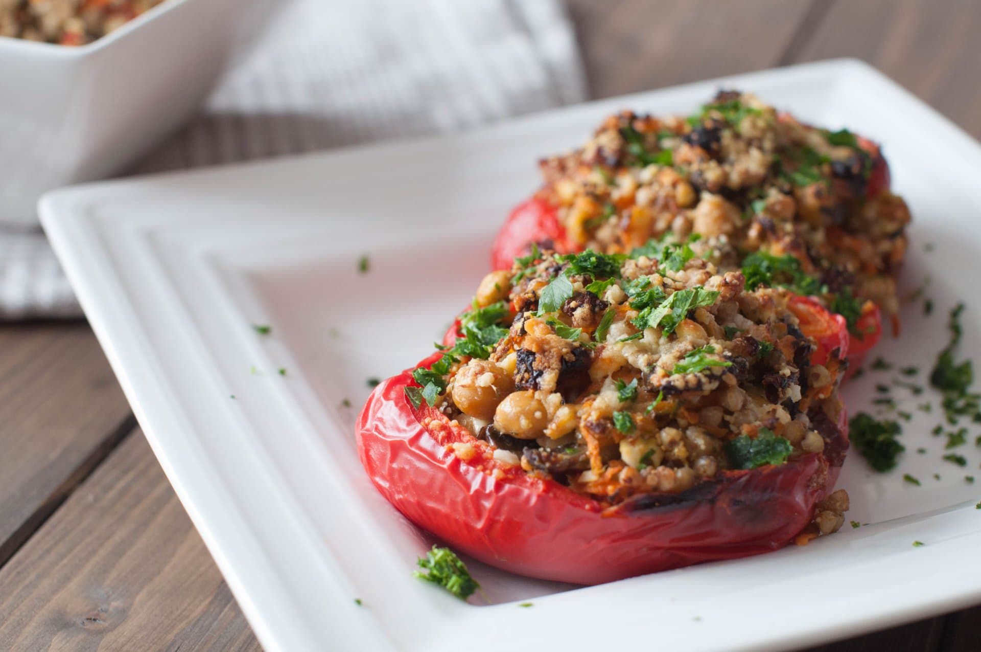 Couper le poivron en deux dans le sens de la longueur et enlever les filaments blancs ainsi que les pépins. Farcir les poivrons avec la salade de sarrasin. Saupoudrer avec du parmesan et un filet d’huile d’olive. Mettre au four pour 15 minutes.