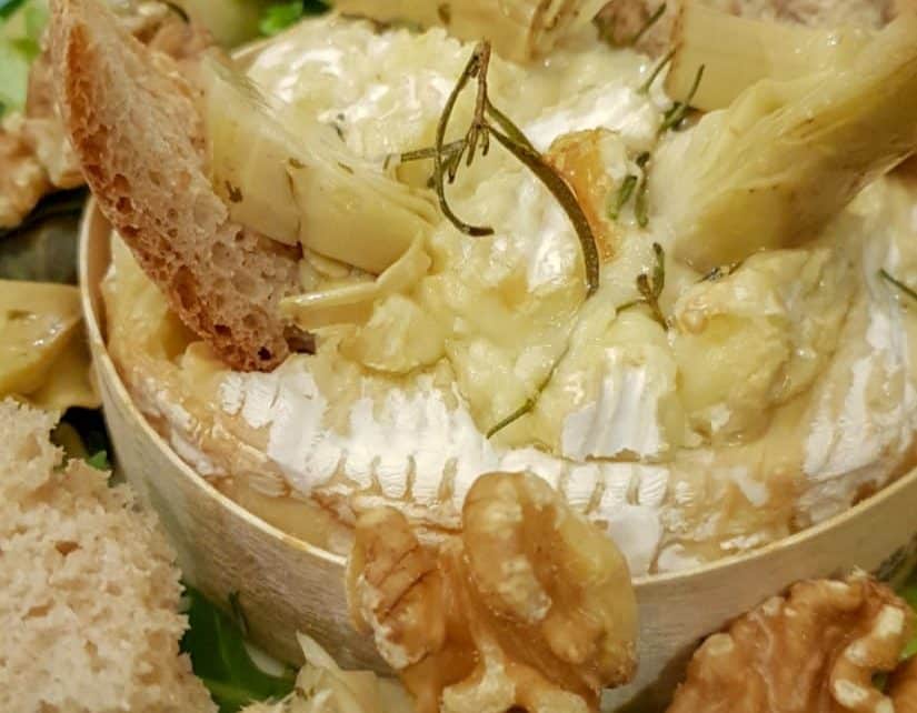 Dès que le fromage est bien fondant, le sortir du four et le mettre au milieu de l’assiette. Ajouter un filet de miel si vous aimez le contraste sucré-salé. Ajouter quelques cœurs d’artichauts et des noix.