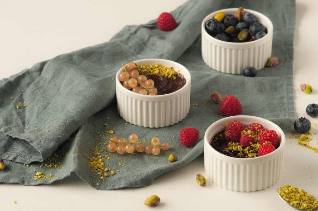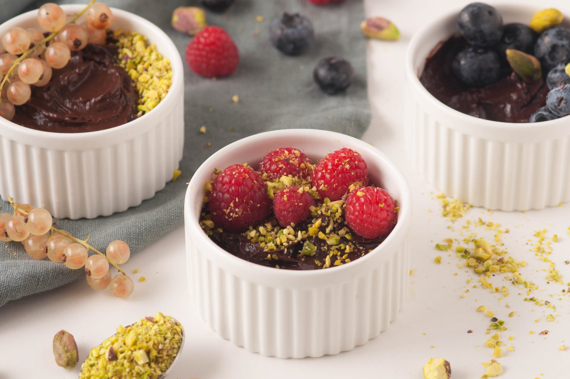 Verser tous les ingrédients dans un mixer plongeur ou un robot culinaire. Mixer jusqu’à obtenir une crème dense et onctueuse. Goûter et rectifier avec le sucre ou le cacao. Verser dans des verres ou ramequins et laisser reposer au frigo au moins une demi-heure. Déguster avec des fruits divers. 🙂