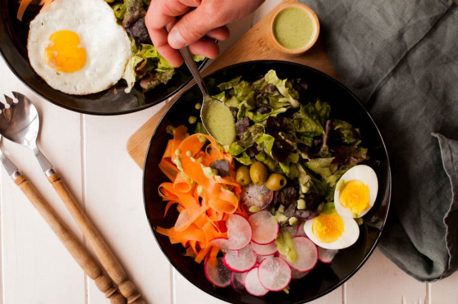 Pour la salade, laver et couper tous les légumes et les distribuer joliment sur l’assiette. Cuire l’œuf à plat ou mollet selon les préférences!